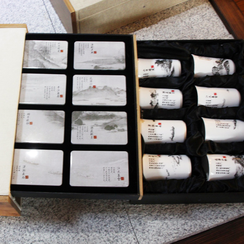 八杯:手握圆柱型深杯,杯面上分别印有北宋宋迪曾选取湖南潇水、湘水合流处的八处景色。